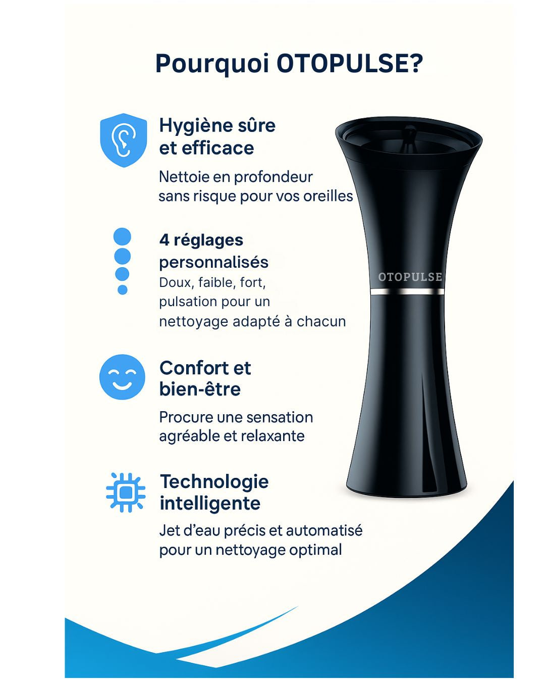 Le kit Otopulse offre un nettoyage sûr, rapide et précis, sans douleur, sans coton-tige et avec un contrôle total de la température et de la puissance du jet.