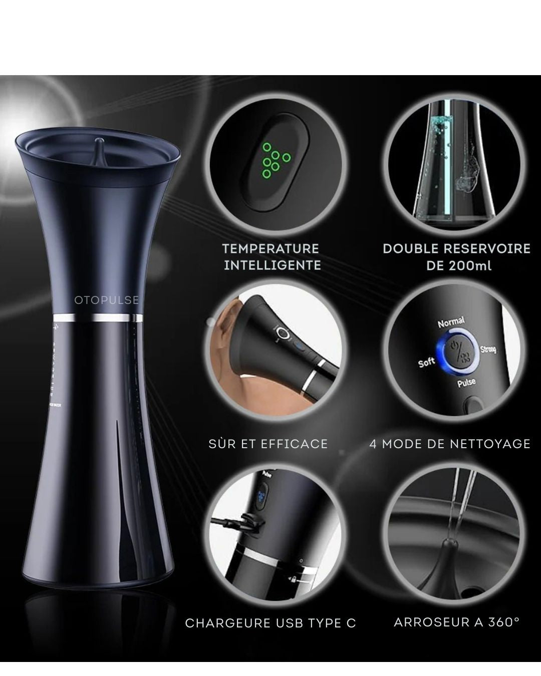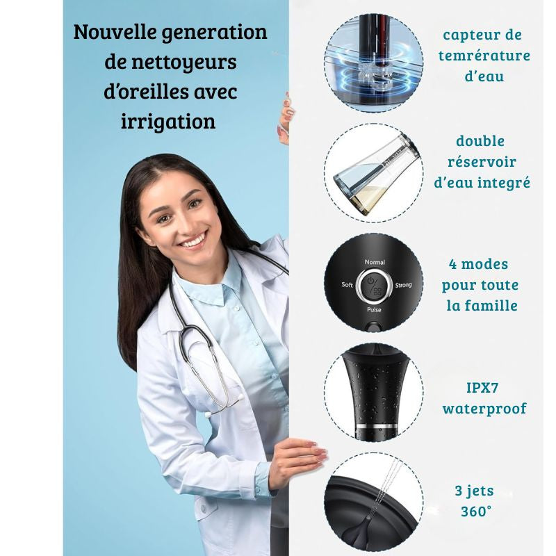 Le kit Otopulse offre un nettoyage sûr, rapide et précis, sans douleur, sans coton-tige et avec un contrôle total de la température et de la puissance du jet.